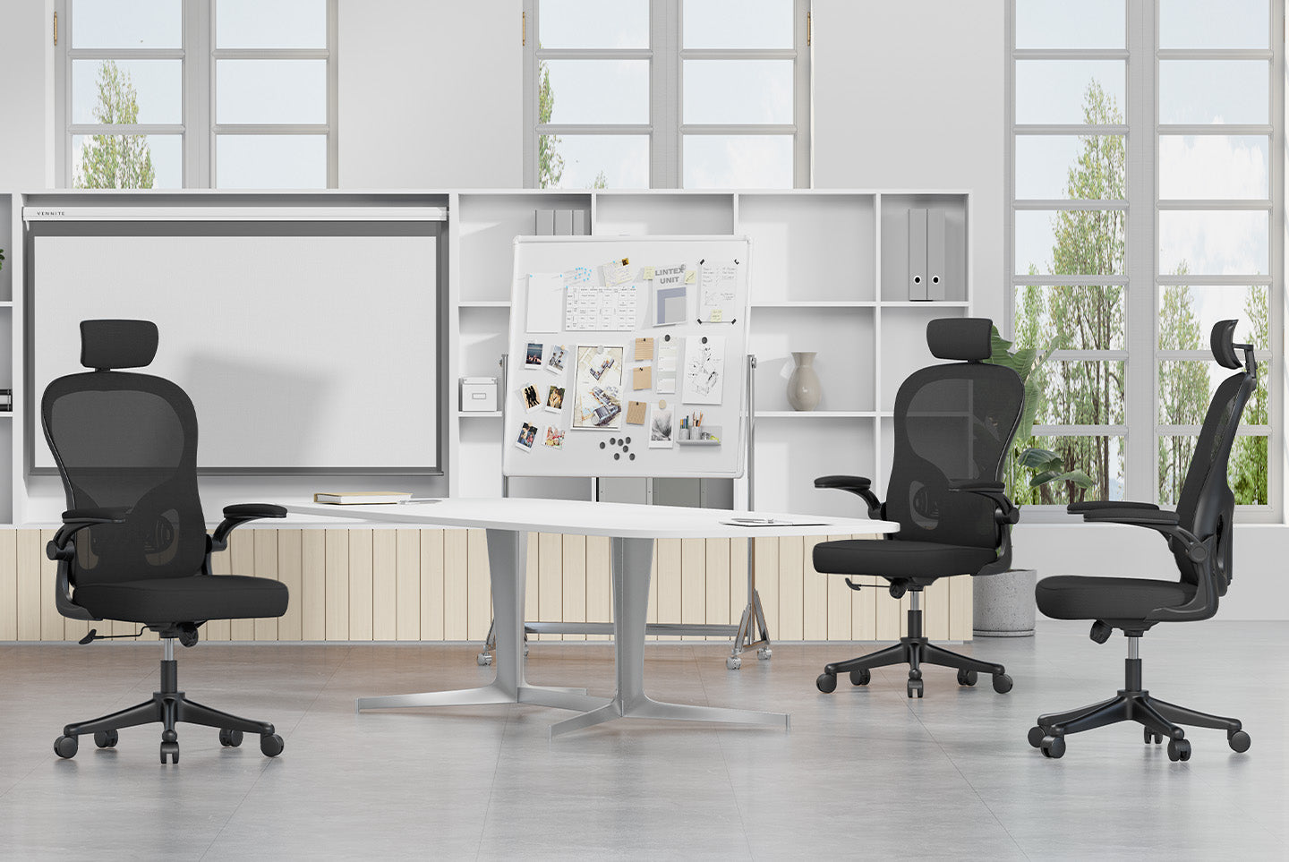 Abaissez les accoudoirs pour soutenir les bras pendant le travail et soulager la fatigue. Se détache du siège, se plie à 90 degrés et se glisse sous le bureau pour le rangement.